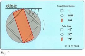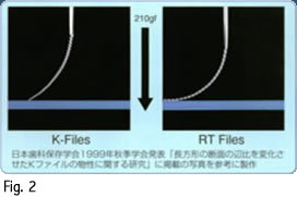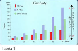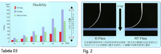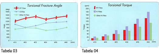 Aumento da capacidade de corte As limas RT tem uma angulação de trabalho de 71º , o que representa aumento considerável em relação às limas convencionais com secção quadrada e angulação de 45º(fig.01). Por tanto as limas RT possibilitam a otimização da modelagem do canal. Remoção de detritos Considerando que os ângulos de corte estão dispostos em um ângulo de corte de 85º eles prolongam o tempo de seu poder de corte. Com os sulcos profundos entre as áreas cortantes e com a concavidade nas lâminas posteriores (Fig. 3) a possibilidade de extruir detritos além do forame apical é grandemente reduzida. ![]() Pré-curvamento As limas NiTi tendem a voltar à sua posição original devido ao seu forte efeito memória, o que significa que estão sempre propensas a cortar excessos de material dentinário do outro lado da curva dos canais radiculares. As limas RT por serem fabricadas em aço inox podem ser pré-curvadas para equiparar-se à curva dos canais radiculares permitindo a instrumentação natural dos mesmos. ![]() Resistência à fratura Os testes de fratura torsional (tabela 3) e de torque de torsão mostraram (tabela 4) que as limas RT tem mais resistência à fratura que as outras limas tipo K. Também apresentam maior resistência à fratura por torque quando comparadas a outras limas tipo K. Portanto são mais seguras para utilização em canais curvos. ![]() |