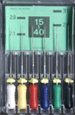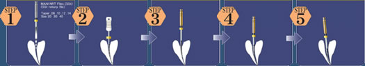 Sequência simples para instrumentação, segundo o fabricante, em 5 etapas. Após seleção apropriada do tamanho do instrumento (D1): #20 para canais radiculares finos #30 para canais radiculares médios #40 para canais radiculares amplos ![]() Etapa 1 – Ampliação do orifício de entrada do canal: Instrumentos de aço inoxidáveis (NRT SSt): Conicidades .08, .10, .12 e .14 Tamanhos #20, #30 e #40 Etapa 2 – Exploração e esvaziamento do canal com instrumento manual do tipo K de fino calibre, determinação do comprimento de trabalho eletronicamente ou convencional por meio de radiografias Etapa 3 – Preparo do terço médio do canal (CRI): NRT NiTi .06 #20, #30 e #40 Etapa 4 – Preparo do terço apical (CRT): NRT NiTi .04 #20, #30 e #40 Etapa 5 – Conicidade final do preparo CRT (formato tronco-cônico gradual, com maior diâmetro cervical): NRT NiTi .06 #20, #30 e #40 Utilizar velocidade de 300 rpm no máximo e controle de torque; cinemática com avanço e retrocesso com suave pressão, similar ao uso de um lápis apontado, recomenda-se utilização de instrumentos manuais para verificação da patência do canal; utilizar com freqüência substâncias químicas e, irrigação e aspiração copiosa. Observações: - CRI: Comprimento Aparente do Dente na radiografia, subtraindo-se 3mm - CRT: Comprimento Real de Trabalho, normalmente de 0,5 a 1,0mm aquém do vértice radiográfico - O acesso ao terço apical deve ser estabelecido usando limas manuais #10 ou #15 - O canal deve ser instrumentado manualmente até a lima #15 antes de iniciar o uso dos instrumentos rotatórios - Use os instrumentos NRT até uma velocidade máxima de 300 RPM ou menos - Use controle de torque de 1-2 N para instrumentos de menores conicidades a 4-5 N para os de maiores conicidades - Para maior segurança, aplique pressão apical moderada - Pressão apical excessiva durante a instrumentação poderá resultar em distorção ou fratura do instrumento - Esterilize todos os instrumentos antes do uso (autoclave de 132º a 136º C) (estufa até 170º C) - Verifique as limas regularmente buscando sinais de deformação ou fadiga, elimine imediatamente qualquer instrumento que apresente anormalidades