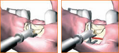 Caso ocorrer o perigo de afetar o nervo alveolar inferior, deverá utilizarse a serra circular dupla (fig. b) (recomenda- se controle radiográfico). |