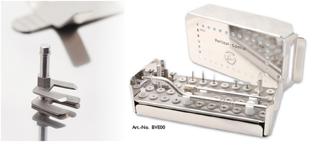 Vertical-Control é um sistema de distração óssea que permite, pela primera vez, um alongamento ósseo vertical mediante um método mínimamente invasivo e previsível em forma tri-dimensional. Especialmente indicado para a região distal do maxilar inferior. Com estes instrumentos totalmente inovadores, pode-se obter excelentes resultados mesmo em casos de atrofías ósseas severas, uma osteogênesis vertical em até 10 mm. Posteriormente e durante a fase de mineralização, pode-se colocar qualquer tipo de implante no segmento ósseo recém-formado. A osteointegração do implante produz-se muito mais rapidamente, graças à alta eficiência do crescimento do calo gerado.