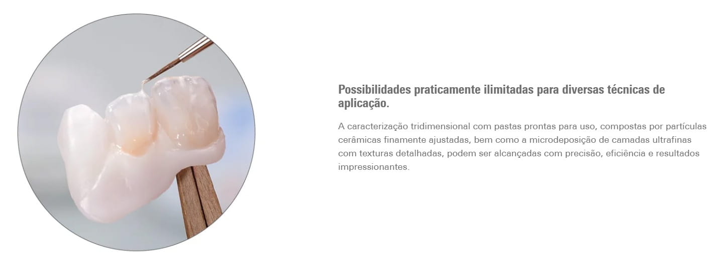 Seja para uma caracterização 3D mais eficiente ou para a aplicação de microcamadas ultrafinas em cerâmica de zircônia, dissilicato de lítio ou feldspato, a VITA LUMEX UNIQUE entrega alto padrão estético com uma rotina de trabalho mais simples e otimizada.