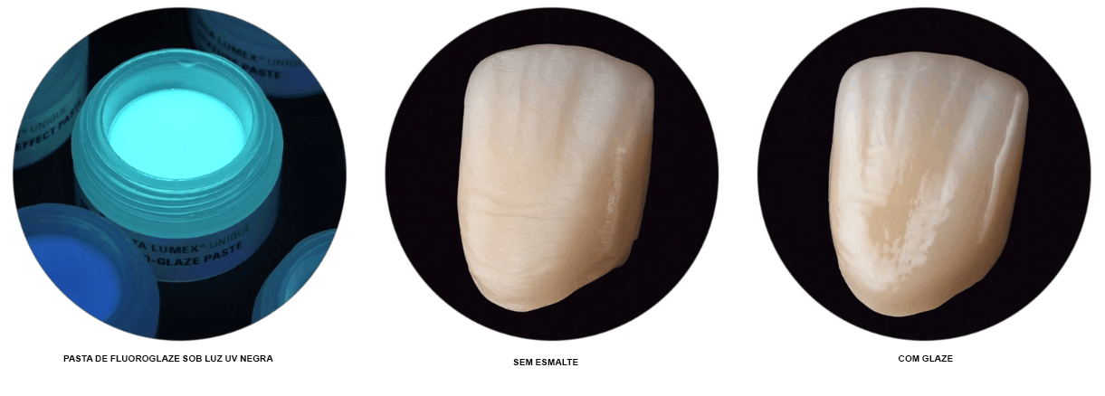 A PASTA FLUO-GLAZE proporciona um acabamento natural que impressiona tanto à luz do dia quanto sob luz negra UV. O glaze é fácil de aplicar e cria uma estética cativante. Como a anatomia mucogengival não fluoresce, a PASTA FLUO-GLAZE não fluorescente está disponível para uma estética rosa natural.