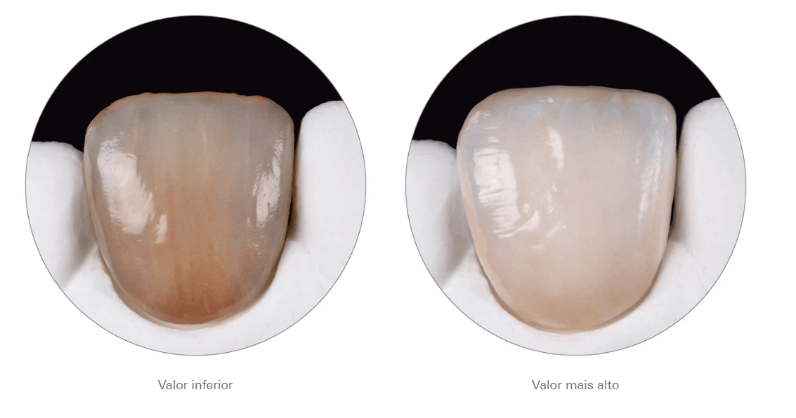O brilho pode ser aumentado ou diminuído, e ajustes sistemáticos de cor podem ser feitos nos dois padrões de cor VITA classic A1-D4 e VITA SYSTEM 3D-MASTER.